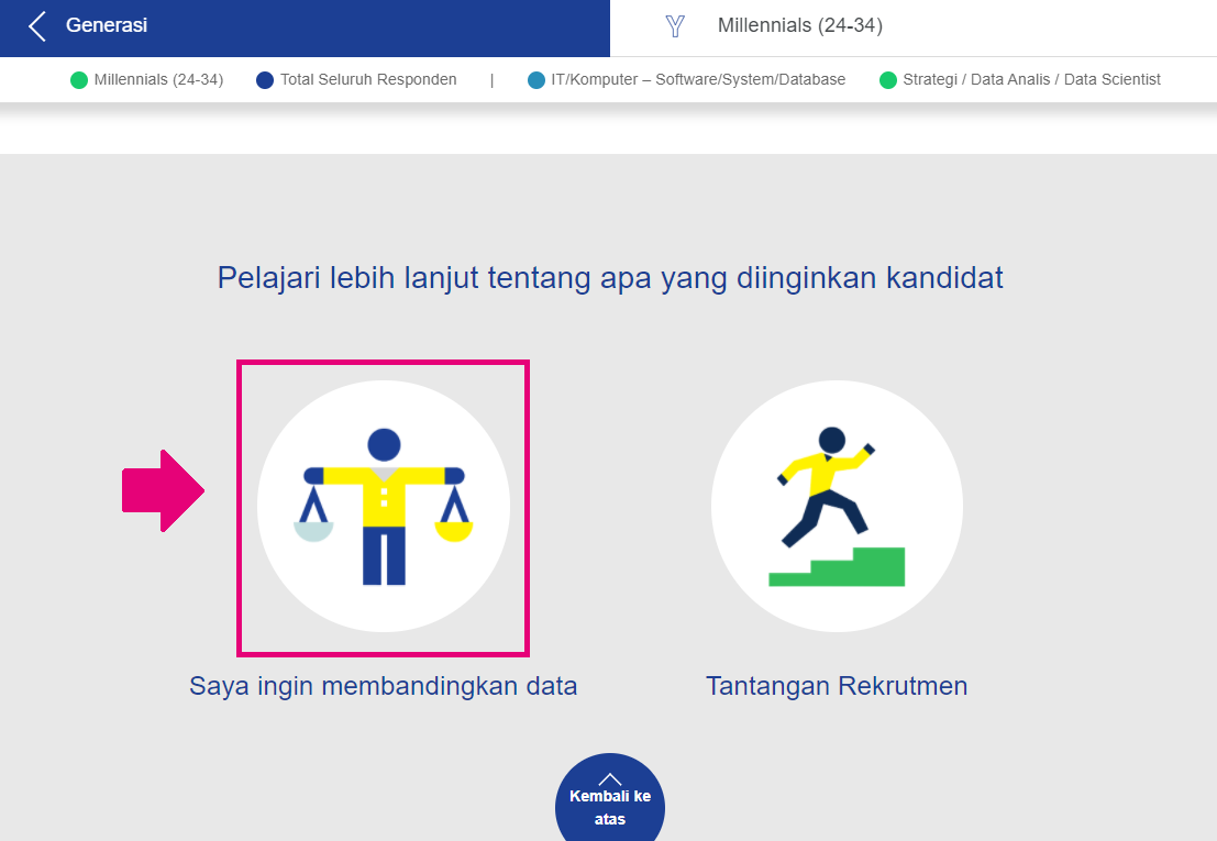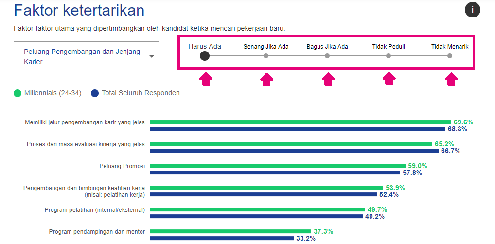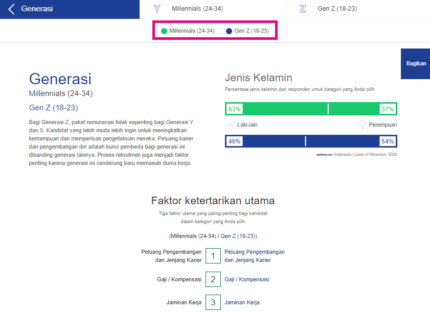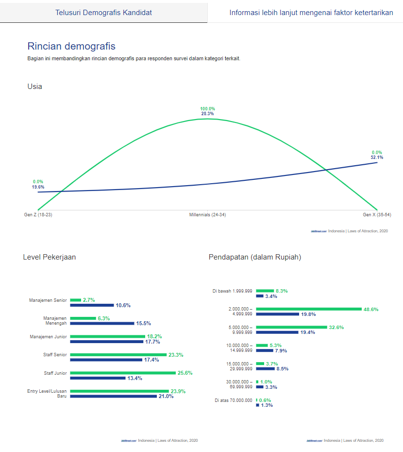 Data kategori yang Anda pilih akan muncul seperti di bawah ini. Bar hijau adalah kategori yang dipilih. Sedangkan bar biru adalah data responden keseluruhan yang mewakili Indonesia market. Sebagai contoh, berdasarkan data ini, ada 63% kandidat laki-laki dan 27% kandidat perempuan di generasi Y, sedangkan secara keseluruhan, ada 55% kandidat laki-laki dan 45% kandidat perempuan. Lalu tiga faktor ketertarikan utama bagi generasi Y bisa dilihat di sebelah kiri yaitu peluang karier di urutan pertama, diikuti gaji dan jaminan kerja. Sedangkan berdasarkan keseluruhan kandidat, gaji ada di urutan pertama lalu peluang karier dan jaminan kerja di urutan kedua dan ketiga.
