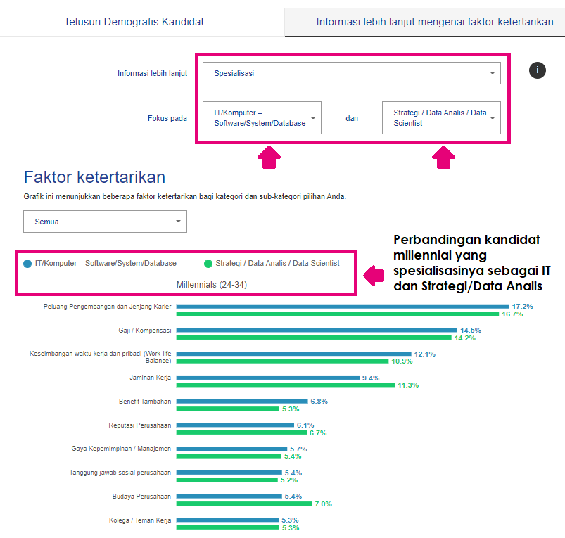 Anda dapat melakukan langkah yang sama dengan sebelumnya untuk membandingkan sub-kategori. Scroll ke bawah lalu klik "Informasi lebih lanjut mengenai faktor ketertarikan" di sebelah tombol demografi. Pilih sub-kategori, sebagai contoh kita pilih sub-kategori yang sama dengan yang sebelumnya yaitu IT dan Strategi/Data Analis. Maka Anda akan melihat data perbandingan dua kategori dan sub-kategori yang telah dipilih. Anda juga dapat melihat lebih detail masing-masing faktor ketertarikan dengan klik "Semua" di sebelah kiri.