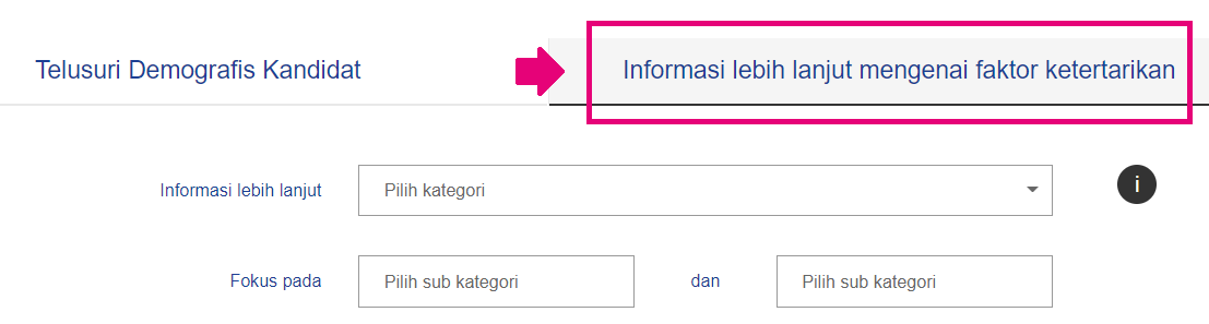 Langkah berikutnya adalah membandingkan antara sub-kategori yang satu dengan sub-kategori lainnya. Anda bisa melakukan ini dengan klik tombol "Informasi lebih lanjut mengenai faktor ketertarikan" di sebelah tombol "Telusuri Demografis Kandidat".
