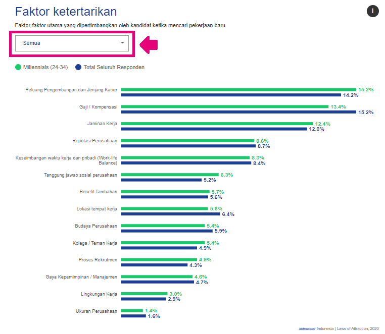 Hasil survei Laws of Attraction kami menunjukkan ada 14 faktor yang dapat menarik kandidat untuk bergabung di perusahaan. Survei ini dilakukan pada lebih dari 9.800 responden di seluruh Indonesia, dari 25 industri dan 24 spesialisasi berbeda. Namun, berbeda dengan hasil survei lainnya yang dikemas dalam sebuah laporan panjang, Anda bisa menelusuri data yang ditampilkan secara dinamis, sesuai kebutuhan dan kategori yang Anda pilih.