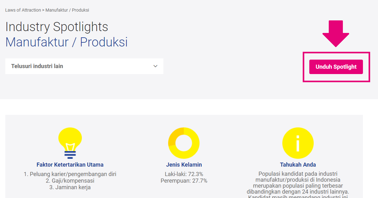 Setelah halaman tentang industri yang Anda pilih terbuka, klik tombol untuk pada kanan atas untuk mengunduh laporan singkat mengenai ketertarikan kandidat pada industri tersebut.