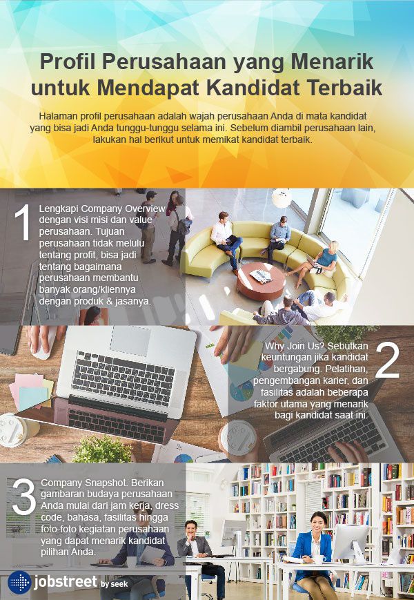 Mulai perbarui profil perusahaan Anda di Jobstreet.com dan lengkapi dengan informasi yang dapat menarik kandidat yang tepat. Jangan sampai Anda melewatkan faktor ini dan kandidat Anda beralih ke perusahaan lain. Lihat infografik di bawah ini untuk tips dan triknya.