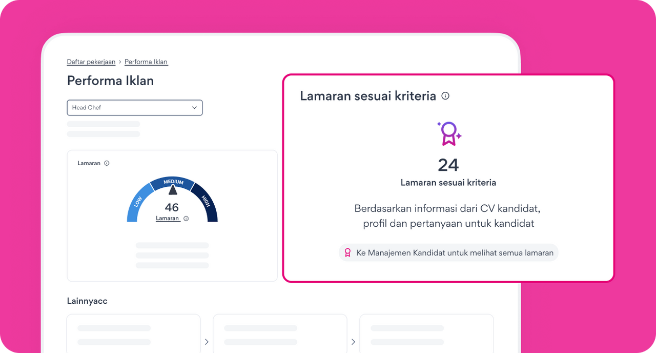 Saat lamaran masuk ke Manajemen Kandidat, Anda akan dapat melihat kandidat mana yang memiliki tingkat kecocokan tinggi beserta alasannya. Wawasan ini membantu Anda memprioritaskan kandidat terbaik, mempercepat proses seleksi dan meningkatkan keyakinan Anda dalam pengambilan keputusan.