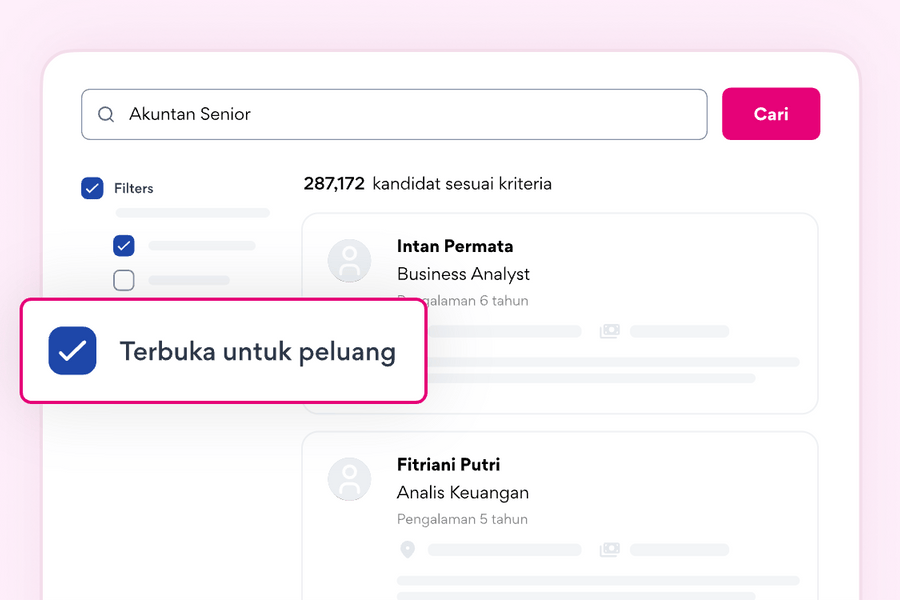 Temukan kandidat relevan dengan cepat melalui pencarian berdasarkan kata kunci atau posisi, lalu persempit hasilnya menggunakan filter canggih seperti industri, perusahaan, gaji, dan lainnya. Dilengkapi teknologi AI fitur saran kandidat serupa, pencarian kandidat kini jadi lebih cepat dan mudah dari sebelumnya.